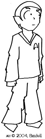 Well, I like to draw Star Trek characters. And, uh, I never really am sure if the cartoon I draw really looks like the real person. That's where you come in. We'll play a game called "Boost Beedrill's Ego." I'll post a drawing of a character, and you can guess who that person is. After a couple of people guess, I'll post the answer and a colored version of the original picture. How does that sound? Fun? I know! And people who guess right get points. Points that don't mean anything, but points are fun!