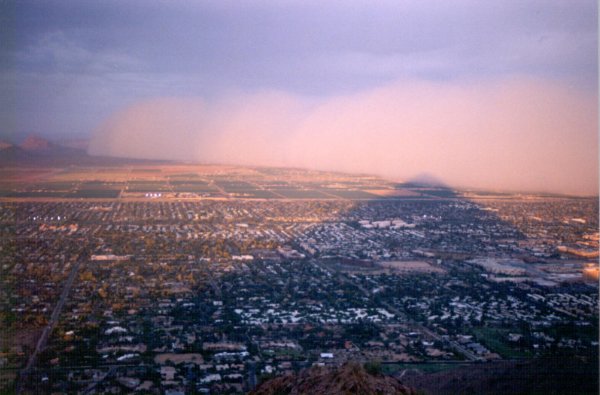 Here's a pic of a dust storm blowing into Phoenix. That's pretty much how they look, it's kind of a rolling wall of dust. We get them pretty often in late summer.