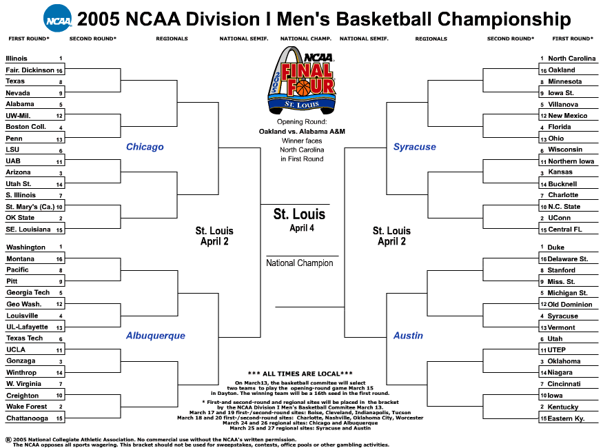 Ace 0 Posted March 17, 2005 Well, I finally did the men's brackets ~~ I misplaced my copy of the women's; will need to check elsewhere ~~ decided to make two separate ones. In the first, I have the Final Four teams as: Illinois, Georgia Tech, UConn, and Syracuse, with the championship going to UConn. Only one of these is a #1 seed.In the second bracket, I selected these four finalists : Arizona, Washington, North Carolina, and Michigan State, with the final winner being Washington . I have two #1 seeds here. Its always a question as to who is going to be upset, who is going to be hot, etc. So what are your predictions? Does anyone agree with my selections? BTW, Ace, I have KY upset by Iowa, or losing to Oklahoma in the third round. Sorry, but no hard feelings? :P 310642[/snapback] I have Kentucky losing to Oklahoma in the third round, so no, no hard feelings. :wink2: Did I mention I have Minnesota getting knocked off in the first round of all but one of my 5 allowable brackets? :whistle: Hmm, I don't see Georgia Tech or UConn making return appearances in the Final Four after last yr, but it's possible. Wait, I think I do have UConn getting there in one bracket. My Final Four... and then some: Austin region: 4Syracuse or 1Duke (darkhorse = none) Albequerque region: 1Washington or 2Wake (darkhorse = 5GA Tech, 6Tex Tech, 4UL) Chicago region: 1Illinois or 2OK St. (darkhorse = 3AZ, 6LSU) Syracuse region: 1UNC or 2Uconn... or 4Florida (darkhorse = 6Wisconsin, 3KS) I think Old Dominion could possibly take out MSU in the opener. You know how dangerous those 5/12's can be. Share this post Link to post Share on other sites